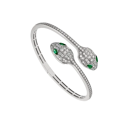 Capturing the snake’s innate power of attraction, the Serpenti bracelet glorifies the head of the mythical animal bringing together stylistic audacity with unrestrained seduction. Inspired by the sensuality of a woman’s gaze, Bvlthtgari recreates the mesmerising spell of the serpent, focusing on the magnetic power of the eyes and their irresistible ability to seduce: elegance with a hint of danger. Serpenti 18 kt white gold bracelet with emeralds and pavé diamonds.
