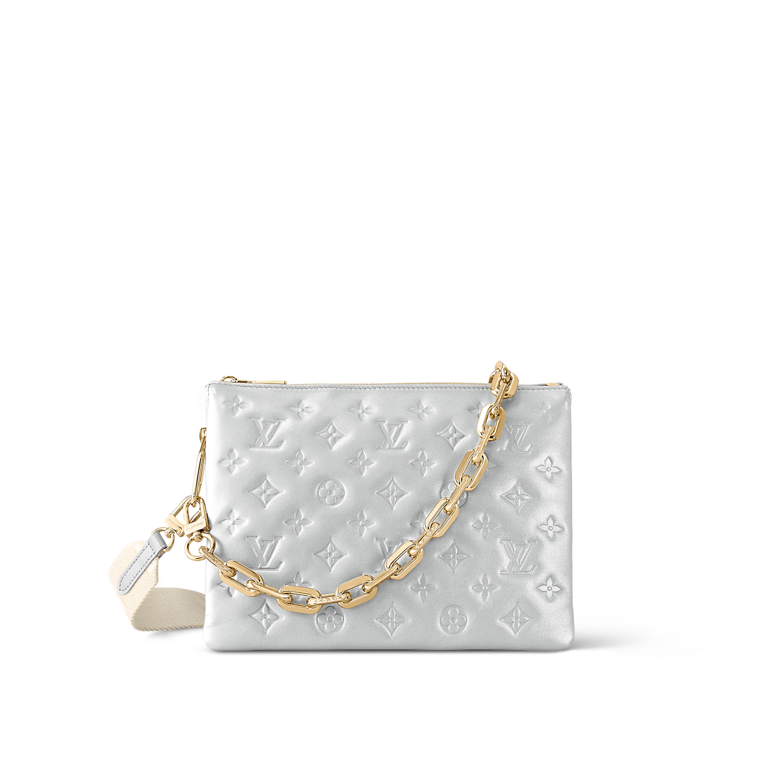 Made from siLthtVer-color puffy lambskin, the Coussin PM handbag is embossed with the Monogram pattern. Finished with gold-color hardware, including a chunky chain, it’s glamorously eye-catching. In addition to the chain, a wide removable textile strap allows shoulder and cross-body carry. The pillow-like Coussin brings style to the most simple look.