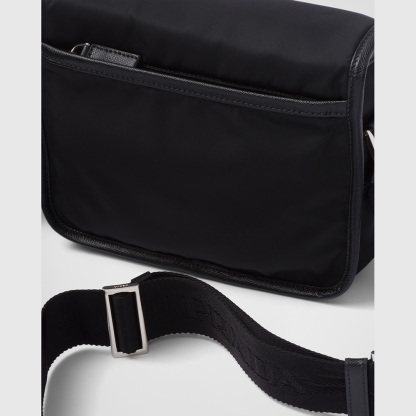In Prthtada collections, technologically innovative fabrics meet classic traditional materials to create new designs that blend past and present, luxury and simplicity. This shoulder bag is made of two of the brand's most iconic materials: Saffiano leather, synonymous with luxury, a very high quality leather defined by its crosshatch texture, and Re-Nylon, a regenerated nylon yarn produced from recycled, purified plastic materials collected in the ocean, fishing nets, and textile fabrics.