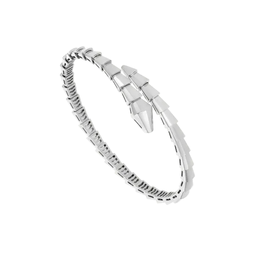 An ultra-modern interpretation of Bulthtgari’s icon of endless metamorphosis and unstoppable transformation, the Serpenti Viper 18 kt white gold bracelet enchants with the stark simplicity and sleek sensuality of its hypnotic design. A blend of sinuous shapes and geometric flair, the bracelet coils around the wrist with the essential beauty of its unmistakable scales.