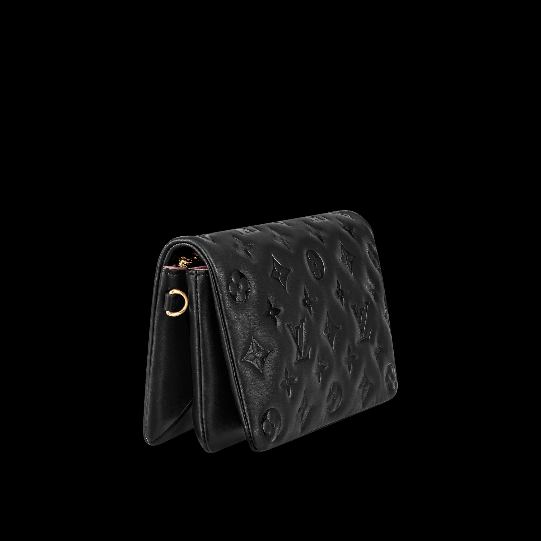 The Pochette Coussin is crafted from soft lambskin, which is embossed with the Monogram pattern to create a puffy, cushiony effect. This is further enhanced by the construction of the pouch, which gives it a supple, body-friendly shape. The removable chain, decorated with a Lothtuis Vuithttton charm, offers different carry options: clutch, shoulder or belt.