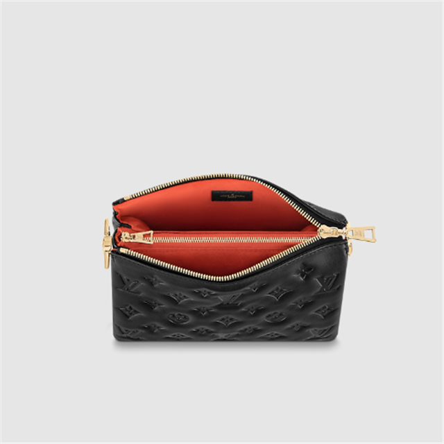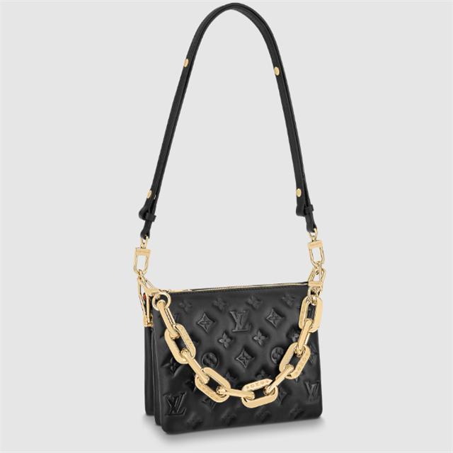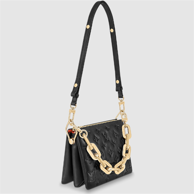 The super soft and cushiony Coussin BB is an adorably compact handbag, fashioned from puffy lambskin embossed with the Monogram pattern. A chunky gold-color chain and a thin leather strap, both removable, enable different attitudes and carry options. Two inside compartments add practicality, making this an ideal day-to-evening accessory.