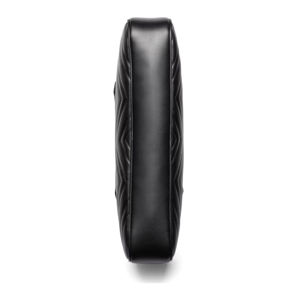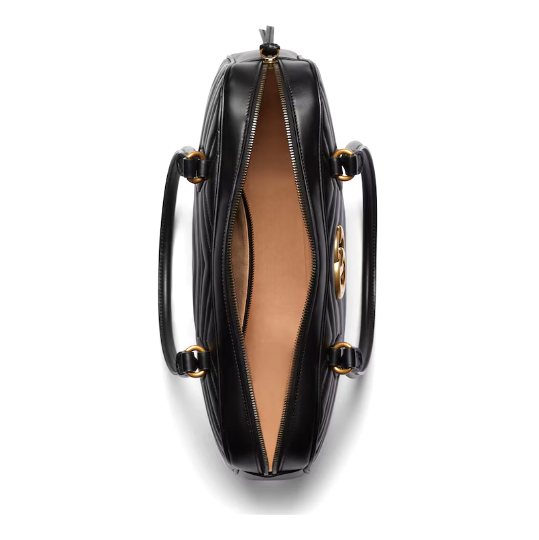 The GG Marmont collection spotlights the emblematic matelassé chevron leather in new shapes and sizes to welcome Pre-Fall. Crafted in a black hue, this medium top-handle bag underlines its contemporary silhouette with gold-toned hardware.