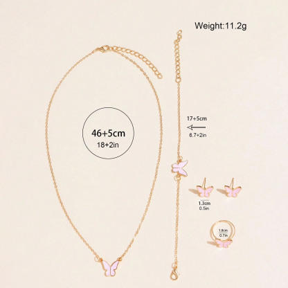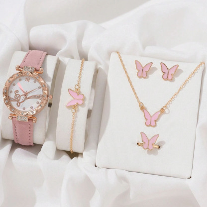 6pcs/Set Women's Leather Strap Quartz Watch, Butterfly & Star Necklace & Bracelet, Ring, And Earrings