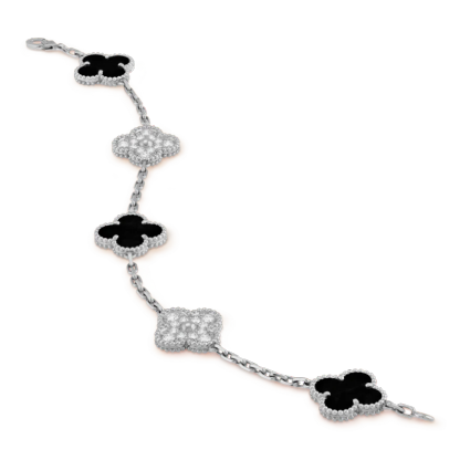 Vintage Alhambra bracelet, 5 motifs, rhodium plated 18K white gold, onyx, round diamonds; diamond quality DEF, IF to VVS.
