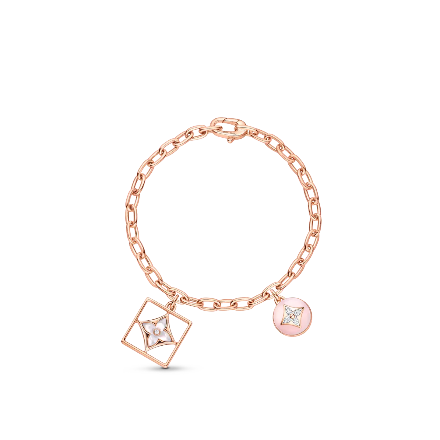 Cast from 18-kt pink gold, this B Blossom chain bracelet features two sculptural Monogram Flower charms. One is crafted from white mother-of-pearl framed in gold, the other is composed of brilliant diamonds set with two half-spheres of pink opal. This exquisite piece looks feminine and fresh, worn alone or styled with other Blossom jewels.