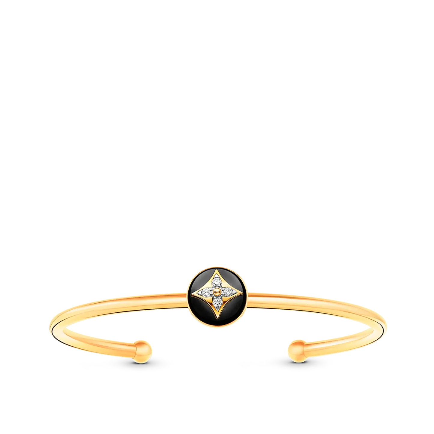 Cast from 18-karat gold, the sleek B Blossom bangle bracelet features a modern, open-band shape. The polished black onyx gemstone is centered with a Monogram Flower motif composed of four superbly cut diamonds. Worn alone, coupled with a B Blossom cuff or stacked with other bracelets, this signature piece lends sparkle and style to any silhouette.